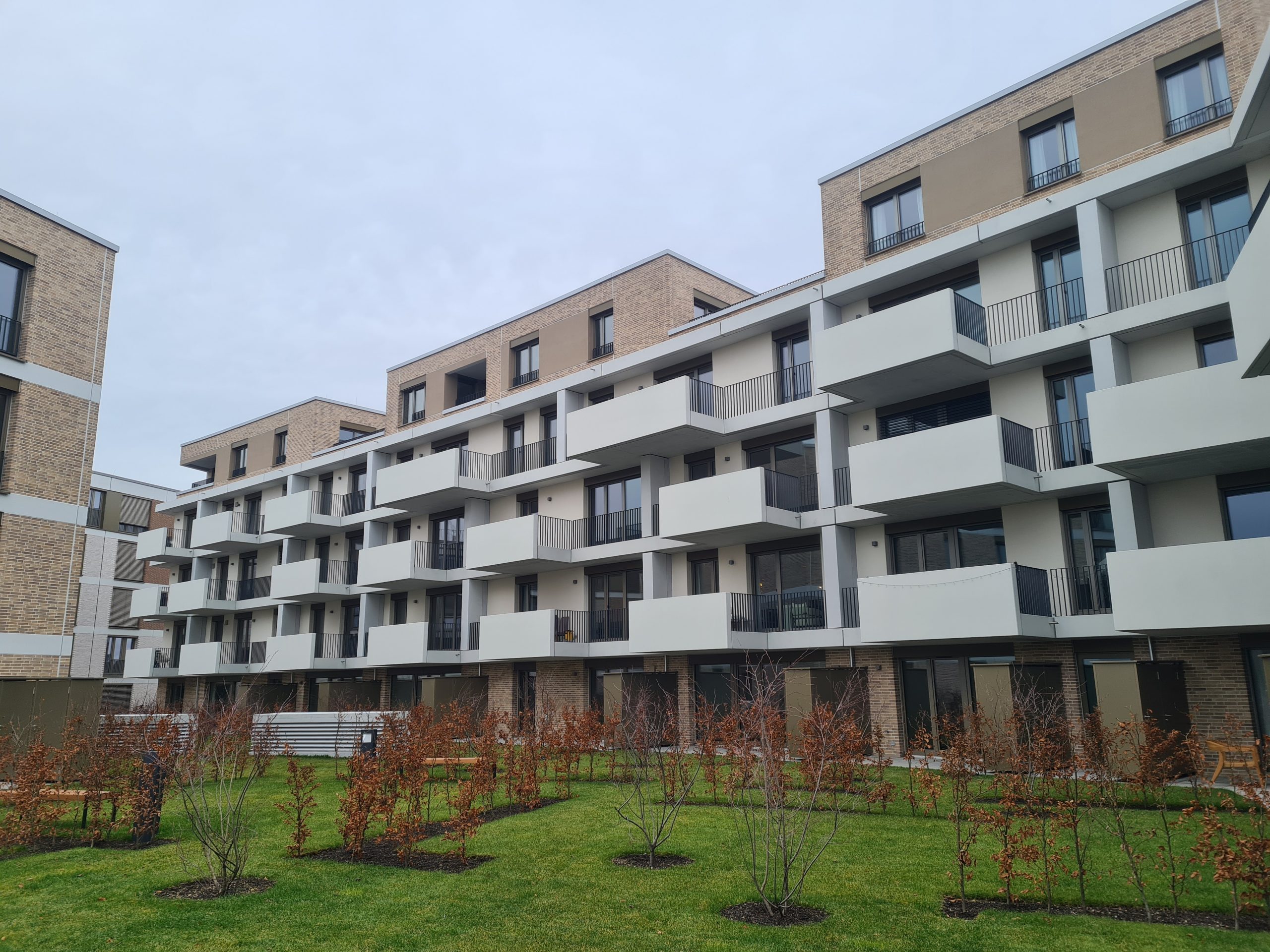 Nach nur ca. 3 Jahren Bauzeit wurde eine sechsgeschossige Blockrandbebauung errichtet, welche sich durch vier Öffnungen und Durchbrüche nach außen hin öffnet. Der innenliegende Freiraum stellt private Gärten für die Bewohner, aber auch gemeinschaftliche Grünbereiche, Aufenthaltsflächen und Spielmöglichkeiten zur Verfügung. Die Architektursprache zeichnet sich durch verspringende Höhen und Fassadentiefen aus und verdeutlicht dadurch die Identität einzelner Häuser innerhalb der Blockrandbebauung. Alle Wohnungen werden in Richtung Süden und Westen orientiert sein, um die einzigartigen Blickbeziehungen zu Schwetzinger Terrasse und Langer Anger aufzunehmen. Die besondere Energieeffizienz der Bahnstadt, durch die Erhaltung des Passivhausstandard, wird auch in dieser Entwicklung gewährleistet. Im Erdgeschoss werden innovative Gewerbeeinheiten vorgesehen, welche die Möglichkeit bieten, Arbeit und Wohnen zu verbinden. Insgesamt sind rund 165 Wohneinheiten mit Wohnflächen von 30 – 150 m² sowie drei Gewerbeeinheiten mit insgesamt ca. 700 m² Nutzfläche und die angeschlossende Tiefgarage geplant.